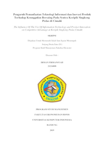 Firmansyah, Irman (2019) Pengaruh Pemanfaatan Teknologi Informasi Dan Inovasi Produk Terhadap Keunggulan Bersaing (Survey Di Sentra Keripik Singkong Pedas Cimahi). Other thesis, Universitas Komputer Indonesia.