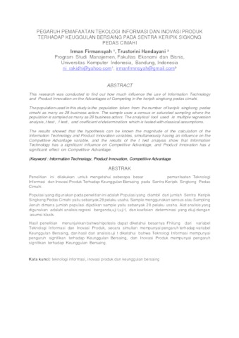 Penelitian ini dilakukan untuk mengetahui seberapa besar pengaruh pemanfaatan Teknologi Informasi dan Inovasi Produk Terhadap Keunggulan Bersaing pada Sentra Keripik Singkong Pedas Cimahi.Populasi yang digunakan pada penelitian ini adalah Populasi yang diambil dari jumlah Sentra Keripik Singkong Pedas Cimahi yaitu sebanyak 28 pelaku usaha. Sample menggunakan sensus atau Sampling Jenuh dimana jumlah populasi dijadikan sample yaitu sebanyak 28 pelaku usaha. Alat analisis yang digunakan adalah analisis regresi berganda, uji t, uji f, dan koefisien determinasi yang diuji dengan asumsi klasik. Hasil penelitian menunjukkan bahwa hipotesis dapat diketahui besarnya Fhitung dari variabel Teknologi Informasi dan Inovasi Produk, secara simultan mempunyai pengaruh terhadap variabel Keunggulan Bersaing, dan hasil dari analisis uji t diketahui bahwa Teknologi Informasi mempunyai pengaruh signifikan terhadap Keunggulan Bersaing, dan Inovasi Produk mempunyai pengaruh signifikan terhadap Keunggulan Bersaing.