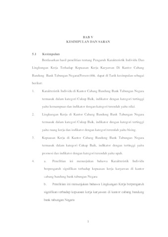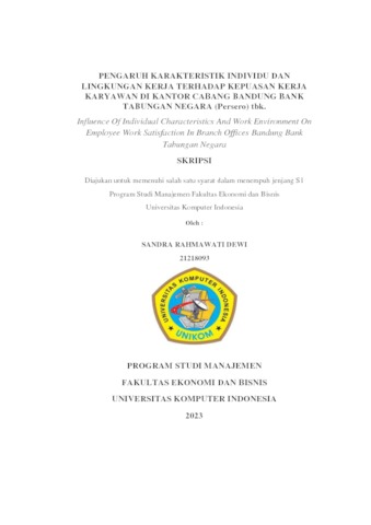 Penelitian ini bertujuan untuk mengetahui gambaran dan menganalisis ada tidaknya pengaruh karakteristik inidvidu dan lingkungan kerja terhadap kepuasan kerja karyawan di kantor cabang bank tabungan negara (persero)tbk. secara parsial maupun simultan. Metode dalam penelitian ini menggunakan deskriptif dan verifikatif. Data yang digunakan dalam penelitian ini adalah data primer untuk penelitian didapatkan hasil kuesioner yang dibagikan kepada 61 responden. Data sekunder diperoleh dari data pegawai cabang Bank Tabungan Negara (Persero) Tbk. Metode analisis yang digunakan adalah analasis regresi menggunakan software SPSS dan pengujian hipotesis uji statistik uji t dan uji f. Hasil menunjukan bahwa Krakteristik Individu mempengaruhi kepuasan kerja dengan hasil signifikan secara parsial dengan arah hubungan negatif, kemudian lingkungan kerja mempengaruhi kepuasan kerja dengan hasil parsial dengan arah hubungan negatif.kepuasan kerja dipengaruhi secara signifikan oleh karakteristik inidvidu dan lingkungan kerja secara simultan menunjukan hubungan negatif, serta kategori hubungan yang kuat.