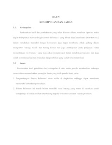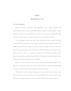 Pasar Induk Caringin merupakan salah satu pasar terbesar di Kota Bandung selain menyediakan barang kepada konsumen Pasar Induk Caringin juga mendistribusikan barang ke pasar lainnya maka dari itu Pasar Induk Caringin memiliki peran vital dalam memenuhi permintaan barang di Kota Bandung. Distributor E2 sendiri menjual berbagai jenis sayur seperti terong, buncis, oyong dan masih banyak lagi, Kendala yang di alami Distributor E2 belum adanya sistem informasi yang dapat mengontrol konsumen dalam berbelanja dan juga tidak adanya laporan penjualan dan laporang barang masuk dan keluar, Metode penelitian yang dilakukan menggunakan metode penelitian kualitatif untuk menjelaskan data yang diteliti dengan mengumpulkan data-data dari sumber primer berupa wawancara, observasi dan sumber sekunder dengan mengumpulkan dokumen – dokumen pendukung. Metode pendekatan yang digunakan menggunakan terstruktur dengan menggunakan alat bantu berupa flowmap, diagram konteks, data flow diagram (DFD), Maka dari itu dibuatlah sebuah sistem informasi pemesanan dan penjualan barang yang di harapkan dapat mempermudah distributor E2 dalam melakukan kegiatan transaksi dan juga dapat mencatat dan memberikan laporan penjualan dan laporan pembelian