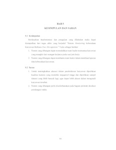 Karyawan merupakan peranan penting bagi perusahaan. Berhasil atau tidaknya perusahaan dalam mencapai target yang ditetapkan sangat tergantung pada kemampuan karyawan dalam menjalankan tugas-tugas yang diberikan. Tetapi tidak semua karyawan menjalankan tugasnya, beberapa karyawan sering mangkir dari tempat kerjanya. Hal ini menyebabkan sulitnya untuk mengetahui ketika ada karyawan yang meninggalkan pekerjaanya. Saat ini upaya yang dilakukan oleh team leader untuk mengatasi masalah ini yaitu dengan menggunakan CCTV sebagai pengawasan di tempat kerja karyawan dan melihat dari data rekap laporan karyawan. Maka dari itu untuk membatasi masalah tersebut dan memanfaatkan kemajuan teknologi penggunaan deteksi wajah, dengan ide sistem monitoring keberadaan karyawan berbasis face recognition yang diharapkan sistem yang dibangun dapat membantu mempermudah team leader untuk mengawasi dan mencatat data dari aktifitas karyawan. Berdasarkan hasil pengujian, didapatkan akurasi pada jarak 1 m keakuratanya mencapai 80-90%, pada jarak 2 m keakuratanya mencapai 60-75% dan pada 3 m keakuratanya mencapai 50-65%. Oleh karena itu pengujian dengan kasus sample uji yang telah dilakukan bahwa jarak yang optimal yaitu 1m – 2m, pencahayaan ruangan juga merupakan sisi penting agar meningkatkan akurasi pengenalan wajah dan yang terakhir adalah kualitas kamera yang digunakan. Dapat disimpulkan bahwa sistem ini dapat membantu team leader memantau karyawan yang mangkir dari ruangan kerjanya pada saat jam kerja dan dapat membantu team leader dalam membuat laporan data keberadaan karyawan.