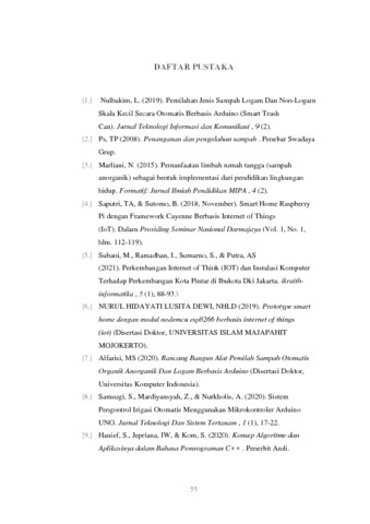 | Uncontrolled Keywords: | Purwarupa, Pengolahan sampah, Daur ulang, Internet of Things |