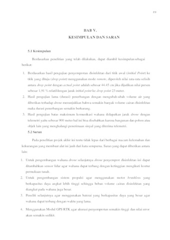 Salah satu permasalahan utama di Indonesia adalah tingginya angka penularan virus covid-19. Corona Virus Disease 2019 atau yang biasa disingkat COVID-19 adalah penyakit menular yang disebabkan oleh SARS-CoV-2, salah satu jenis koronavirus. Penderita COVID-19 dapat mengalami demam, batuk kering, dan kesulitan bernafas. Perlunya tindakan tindakan untuk penanganan dari dampak pandemi ini di dunia maupun khsusnya di Indonesia. Cairan yang disemprotkan adalah campuran antara virkon dan air dengan metode pengembunan. Senyawa ini diklaim mampu membunuh bakteri dan virus seperti virus corona. Penyemprotan ini dilakukan secara menyeluruh di lingkungan yg terdampak zona merah, penggunaan cairan disinfektan hingga tenaga kerja. Diharapkan dengan tindakan rekayasa Penyemprotan Disinfektan dan desinfeksi ruangan khususnya masjid Jogokariyan ini dapat sebagai upaya pencegahan Dan Penyebaran Virus, bakteri, kuman dan sejenisnya. Berdasarkan penelitian yang telah dilakukan, dapat diambil kesimpulan berdasarkan hasil pengujian penyemprotan disinfektan dari titik awal (initial Point) ke titik yang dituju (drop point) menggunakan mode remote, diperoleh nilai rata-rata selisih antara drop point dengan actual point adalah sebesar 44.45 cm jika dijadikan nilai persen sebesar 1,91 % relatif dengan jarak initial point ke drop point 23 meter. Kemudian hasil pengujian lama (durasi) penerbangan dengan mengubah-ubah volume air yang diberikan terhadap drone menunjukkan bahwa semakin banyak volume cairan disinfektan maka durasi penerbangan semakin berkurang dan hasil pengujian batas maksimum komunikasi wahana didapatkan jarak drone dengan telemetri yaitu sebesar 900 meter hal ini bisa disebabkan karena bangunan dan pohon atau objek lain yang menghalangi penerimaan sinyal yang diterima