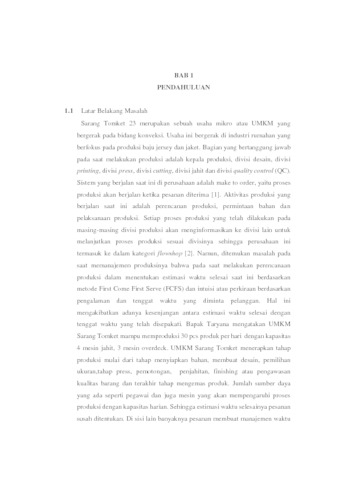 Sarang Tomket 23 adalah sebuah usaha mikro yang bergerak di bidang konveksi pembuatan jersey dan jaket. Sarang Tomket 23 setiap harinya bekerja 18 jam dari hari Senin hingga Sabtu yang dimulai dari jam 8 pagi. Strategi bisnis dan pengerjannya menggunakan make to order dan FCFS (First Come First Serve). Pada saat ini Kepala Produksi menggunakan estimasi waktu selesai untuk produksi dengan menggunakan perkiraan berdasarkan pengalaman dan dalam memonitoring Kepala Produksi akan mengecek satu persatu dari setiap divisi sehingga dapat memakan waktu sehingga dapat disimpulkan bahwa Kepala Produksi kesulitan dalam menentukan estimasi waktu selesai dan kesulitan dalama memonitoring produksi di setiap divisi. Dari permasalahan yang terjadi, maka penelitian menyarankan menggunakan Sistem Informasi Manajemen Produksi dengan metode improve algoritma Hodgson yang dapat meminimalisir keterlambatan akibat penggunaan FCFS yang tanpa memerhatikan dateline setiap pesanan dan melakukan pengurutan pengerjaan sehingga penjadwalan menjadi optimal