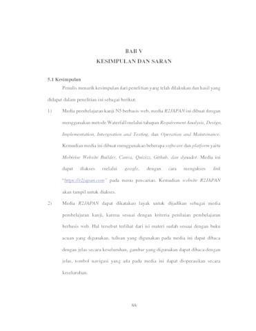 Penelitian ini bertujuan untuk mengetahui proses pembuatan media R2JAPAN dan mendeskripsikan tanggapan responden terhadap media R2JAPAN. Metode penelitian yang digunakan adalah Waterfall, melalui tahapan requirement analysis, design, implementation, intergration and testing, operation and maintenance. Pengumpulan data mengenai tanggapan responden dilakukan dengan cara penyebaran kuesioner yang dibagikan melalui google form, dan dihitung menggunakan skala likert. Sampel dalam penelitian ini adalah 32 mahasiswa tingkat satu program studi Sastra Jepang tahun angkatan 2022/2023. Hasil penelitian menunjukkan bahwa pembuatan media R2JAPAN menggunakan software Mobirise Website Builder sebagai pembuatan website, Software Canva untuk membuat logo serta gambar yang ada pada media ini, platform Quizizz untuk membuat fitur quiz/latihan soal, platform Github untuk melakukan publikasi media R2JAPAN sehingga media ini dapat diakses dalam bentuk website, platform Dynadot untuk mengganti domain website. Kemudian, nilai persentase Tanggapan terhadap Media R2JAPAN adalah sebesar 90.7%. Sehingga media R2JAPAN dapat dikatakan layak sebagai media pembelajaran kanji bahasa Jepang tingkat dasar/level N5.