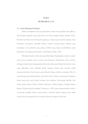 Tujuan dari penelitian ini adalah untuk mendeskripsikan onomatope yang ada dalam komik berdasarkan bentuk dan maknanya. Metode yang digunakan penulis adalah metode deskriptif dengan pendekatan kualitatif. Sumber data penelitian ini adalah onomatope dari komik yang berjudul Fumetsu No Anata E Volume 1 yang berada diluar dialog percakapan baik itu di dalam balon percakapan maupun diluar balon percakapan. Hasil dari penelitian ini terdapat 9 bentuk onomatope diantaranya onomatope bentuk dasar, pengulangan, pemadatan suara (sokuon), pemanjangan bunyi (chouon), penasalam suara (hatsuon), perubahan sebagian bunyi, pengulangan kata + sokuon, sokuon + pengulangan, dan hatsuon + pengulangan. Sedangkan, makna onomatope terbagi ke dalam klasifikasi makna yang berhubungan dengan manusia (人間) seperti berjalan, makan, suara teriakan, suara tangisan, keadaan tersenyum, bersemangat, dan sebagainya. Lalu klasifikasi makna yang berhubungan dengan hal-hal (事物) seperti bergesekan, berguling, bunyi patahan, bunyi berbenturan, keadaan saat benda meregang, dan sebagainya. Kemudian klasifikasi makna yang berhubungan dengan alam (自然) seperti keadaan berangin, suara air mengalir, dan sebagainya. Terakhir, klasifikasi makna lainnya (その他) seperti gerakan menggigit, menarik, suara geraman hewan, suara teriakan hewan, keadaan saat merinding, dan sebagainya.