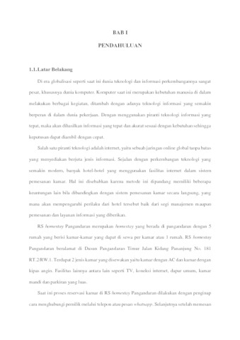 Di era globalisasi seperti saat ini dunia teknologi dan informasi perkembangannya sangat pesat, khususnya dunia komputer. RS homestay Pangandaran merupakan homestay yang berada di pangandaran dengan 5 rumah yang berisi kamar-kamar yang dapat di sewa per kamar atau 1 rumah. Permasalahan yang terjadi di RS homestay Pangandaran antara lain belum memiliki website yang dapat memberikan informasi kepada calon penginap yang ingin menginap mengenai harga sewa, status ketersediaan kamar dan form reservasi online yang menyebabkan penginap kesulitan mendapatkan informasi tentang ketersediaan kamar, harga sewa dan lainnya. Selain itu Proses reservasi yang melalui telepon atau pesan whatsapp masih kurang efektif dikarenakan pemilik harus membalas satu persatu pesan penginap yang menanyakan informasi ketersediaan kamar sesuai tanggal yang diinginkan Metode penelitian yang digunakan dalam penelitian ini adalah metode deskriptif. Selain itu menggunakan metode pendekatan sistem berorientasi objek dan metode pengembangan sistem prototype dengan alat bantu diagram UML. Dengan dibangunnya sistem ini dapat membantu pengurus homestay dalam bekerja, sehingga dapat mempermudah dan meminimalisir kesalahan, kehilangan data, meningkatkan kinerja pengurus dan meningkatkan pelayanan reservasi kepada penginap.