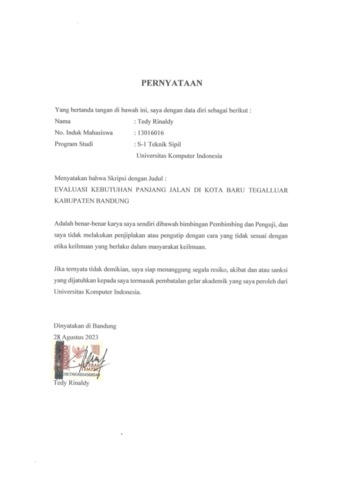 Rinaldy, Tedy (2023) Evaluasi Kebutuhan Panjang Jalan Di Kota Baru Tegalluar Kabupaten Bandung. Other thesis, Universitas Komputer Indonesia.