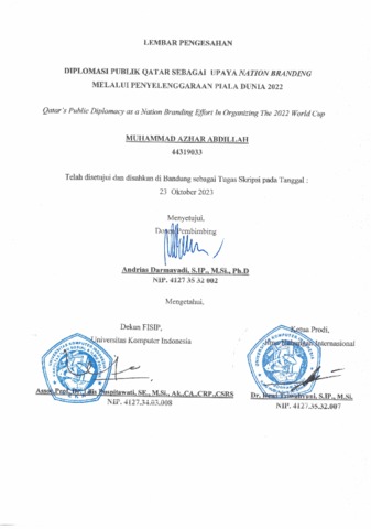 Abdillah, Muhammad Azhar (2023) Diplomasi Publik Qatar Sebagai Upaya Nation Branding Melalui Penyelenggaraan Piala Dunia 2022. Other thesis, Universitas Komputer Indonesia.