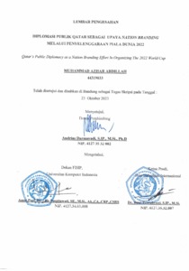 | Uncontrolled Keywords: | Diplomasi Publik, Nation Branding, Piala Dunia, Qatar |