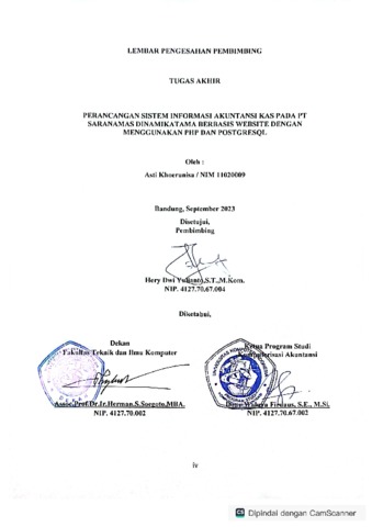 Khoerunisa, Asti (2023) Perancangan Sistem Informasi Akuntansi Kas Pada Pt Saranamas Dinamikatama Berbasis Website Dengan Menggunakan Php Dan Postgresql. Diploma thesis, Universitas Komputer Indonesia.