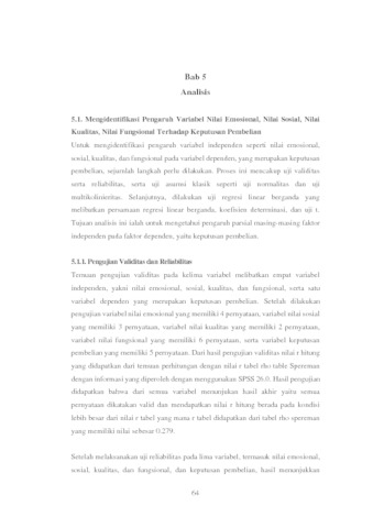 Penelitian ini dilakukan di Perusahaan Tahu Sutra Aslina DA’BE’DA. Perusahaan tahu sutra merupakan perusahaan yang bergerak pada bidang industri makanan khususnya dalam pembuatan produk makanan yaitu tahu. Tahu yang diproduksi oleh perusahaan ini memiliki keunikan dan keunggulan tersendiri yang dapat membedakan dengan produk tahu pada umumnya, karena terdapat perbedaan dalam proses pengolahan pembuatan tahu tersebut sehingga hasil dari pembuatan tahu memiliki tekstur lembut ketika dimakan. Untuk mempertahankan penjualan yang ada maka harus dilakukan penelusuran tentang keputusan pembelian pelanggan, yang dilihat dari sejauh mana pengaruh pelanggan dalam memutuskan pembelian, yang dapat dilihat dari faktor penentu keputusan pembelian. Perusahaan belum mengetahui faktor apa saja yang menjadi penentu keputusan pembelian. Terdapat nilai-nilai dari pelanggan untuk dapat mempengaruhi keputusan pembelian seperti nilai emosional, nilai sosial, nilai kualitas dan nilai fungsional. Untuk mengidentifikasi faktor pelanggan dalam membeli produk di perusahaan, digunakan metode kuesioner dan hasilnya diproses dengan menggunakan regresi linier berganda. Kuesioner yang dibuat berdasarkan rancangan variabel kuesioner dengan menggunakan variabel nilai emosional, nilai sosial, nilai kualitas, nilai fungsional yang menjadi variabel independen dan keputusan pembelian yang menjadi variabel dependen. Berdasarkan perhitungan yang telah dilakukan didapatkan kesimpulan pengaruh parsial antara variabel independen pada variabel dependen yaitu pengaruh nilai emosional pada keputusan pembelian sebesar 1.911 bersifat tidak signifikan, pengaruh nilai sosial pada keputusan pembelian sebesar 0.526 bersifat tidak signifikan, pengaruh nilai kualitas pada keputusan pembelian sebesar 1.386 bersifat tidak signifikan, pengaruh nilai fungsional pada keputusan pembelian sebesar 4.954 memiliki pengaruh signifikan. Hasil frekuensi jawaban setiap indikator nilai fungsional yang mempengaruhi keputusan pembelian, seperti melalui kemasan produk yang berpengaruh sebesar 15.92%, kualitas jasa yang berpengaruh sebesar 16.56%, persediaan produk yang berpengaruh sebesar 17.36%, kebersihan lingkungan yang berpengaruh sebesar 17.36%, manfaat kesehatan yang berpengaruh sebesar 16.24%, dan fungsi kemasan dalam keamanan produk yang berpengaruh sebesar 16.56%. Nilai fungsional yang paling kuat mempengaruhi keputusan pembelian yaitu persediaan produk dan kebersihan lingkungan sebesar 17.36%.