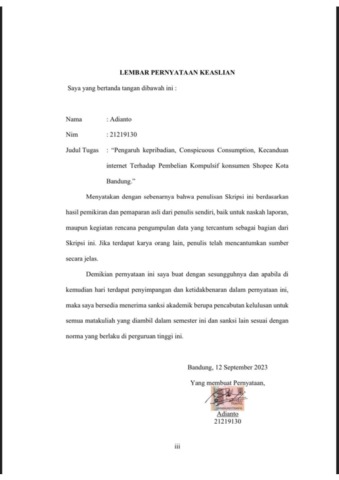 | Uncontrolled Keywords: | Kepribadian, konsumsi mencolok , Kecanduan Internet, Pembelian kompulsif, Shopee |