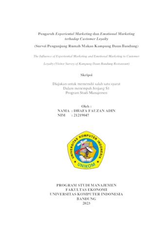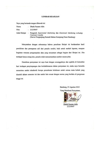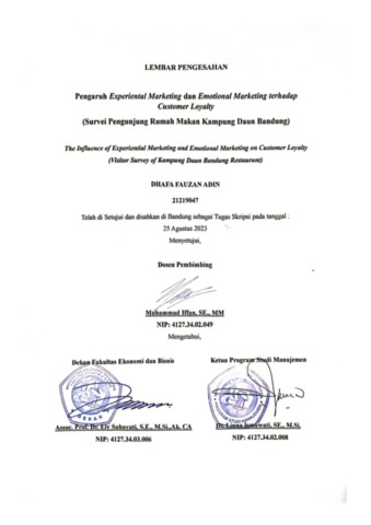 Adin, Dhafa Fauzan (2023) Pengaruh Experiental Marketing dan Emotional Marketing terhadap Customer Loyalty (Survei Pengunjung Rumah Makan Kampung Daun Bandung). Other thesis, Universitas Komputer Indonesia.