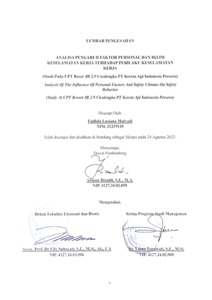 Penelitian ini memiliki tujuan untuk mengetahui dan menganalisis ada atau tidak adanya pengaruh faktor personal dan iklim keselamatan kerja terhadap perilaku keselamatan kerja di UPT Resor JR 2.9 Cicalengka PT Kereta Api Indonesia (Persero) baik secara parsial maupun simultan. Metode penelitian yang digunakan yaitu pendekatan kuantitatif, deskriptif, dan verifikatif. Populasi dalam penelitian ini yaitu 66 pegawai UPT Resor JR 2.9 Cicalengka yang terdiri dari 21 pegawai organik dan 45 pegawai outsourcing, dengan jumlah sampel keseluruhan dari populasi yaitu 66 pegawai. Teknik penarikan sampel yang digunakan yaitu teknik sampling jenuh atau teknik sensus. Metode analisis yang digunakan adalah persamaan regresi linier berganda menggunakan aplikasi SPSS v25 dan pengujian hipotesis uji statistik uji t dan uji statistik uji f. Hasil yang diperoleh menunjukkan bahwa perilaku keselamatan kerja tidak dipengaruhi secara signifikan oleh faktor personal secara parsial, perilaku keselamatan kerja dipengaruhi secara signifikan oleh iklim keselamatan kerja secara parsial, dan perilaku keselamatan kerja dipengaruhi secara signifikan oleh faktor personal dan iklim keselamatan kerja secara simultan.
