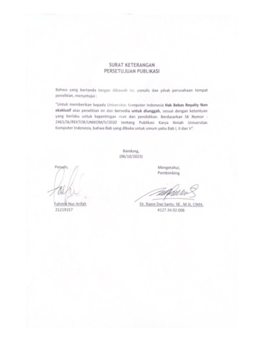 UNIKOM_FAHMIA NUR ARIFAH_SURAT KETERANGAN PERSETUJUAN PUBLIKASI.pdf - Published Version