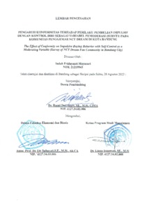 Penelitian ini bertujuan untuk mengetahui pengaruh konformitas terhadap perilaku pembelian impulsif dengan kontrol diri sebagai variable pemoderasi pada penggemar komunitas NCT Dream. Penelitian ini dilakukan dengan pendekatan kuantitatif dengan metode penelitian deskriptif dan verifikatif. Permasalahan dalam kajian ini yaitu bagaimana pengaruh konformitas terhadap perilaku pembelian impulsif dengan kontrol diri sebagai variabel pemoderasi secara parsial. Pengumpulan data primer dilakukan dengan menyebar kuesioner pada sampel sebanyak 182 penggemar NCT Dream. Metode analisis yang digunakan dalam penelitian ini adalah analisis SEM-PLS. Hasil penelitian ini menunjukkan variabel konformitas secara parsial mempunyai pengaruh terhadap perilaku pembelian impulsif. Serta adanya keterkaitan konformitas terhadap perilaku pembelian impulsif dengan kontrol diri sebagai variabel pemoderasi memiliki pengaruh yang tidak signifikan. Rekomendasi bagi peneliti selanjutnya diharapkan mampu memberikan pencerahan kepada individu (penggemar) mengenai seberapa besar tingkat pengaruh konformitas terhadap perilaku pembelian impulsive dengan kontrol diri sebagai variabel pemoderasi. Penelitian tersebut dapat memperkuat konformitas terhadap perilaku pembelian impulsif dengan kontrol diri sebagai variabel pemoderasi yang dapat memberikan peluang yang signifikan untuk menciptakan suatu peluang dalam pembelian impulsif dan berpotensi mempengaruhi perilaku pembelian impulsif secara signifikan.