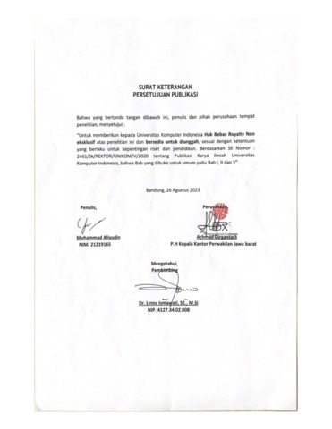 UNIKOM_MUHAMMAD ALIYUDIN_SURAT KETERANGAN PERSETUJUAN PUBLIKASI.pdf - Published Version