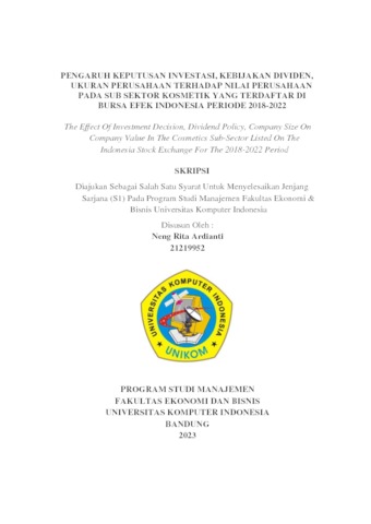 Ardianti, Neng Rita (2023) Pengaruh Keputusan Investasi, Kebijakan Dividen, Ukuran Perusahaan Terhadap Nilai Perusahaan Pada Sub Sektor Kosmetik Yang Terdaftar di Bursa Efek Indonesia Periode 2018-2022. Other thesis, Universitas Komputer Indonesia.