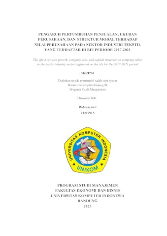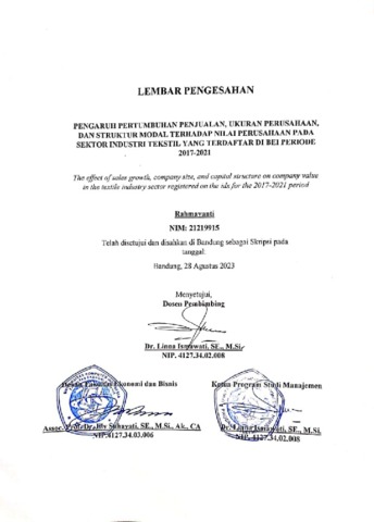 Rahmayanti, Rahmayanti (2023) Pengaruh Pertumbuhan Penjualan, Ukuran Perusahaan, Dan Struktur Modal Terhadap Nilai Perusahaan Pada Sektor Industri Tekstil Yang Terdaftar Di Bei Periode 2017-2021. Other thesis, Universitas Komputer Indonesia.