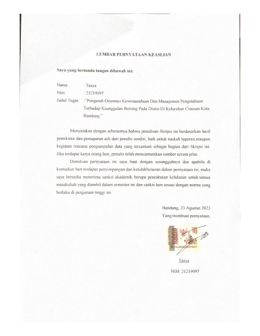 Tasya, Tasya (2023) Pengaruh Orientasi Kewirausahaan Dan Manajemen Pengetahuan Terhadap Keunggulan Bersaing Pada Distro Di Kelurahan Citarum Kota Bandung. Other thesis, Universitas Komputer Indonesia.