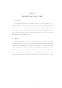 Hasil pengujian terhadap prototipe aplikasi pembelajaran karangan Bahasa Sunda yang telah dibuat menunjukkan nilai rata-rata performansi yang memenuhi tujuan pengujian. Dengan demikian, dapat disimpulkan bahwa model desain interaksi aplikasi pembelajaran karangan Bahasa Sunda dalam bentuk permainan yang dihasilkan dalam penelitian ini telah berhasil mencapai tujuan yang telah ditetapkan, serta sesuai dengan kebutuhan dan karakteristik anak-anak kelas 5 sekolah dasar.