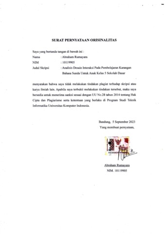 Rumayara, Abraham (2023) Analisis Desain Interaksi Pada Pembelajaran Karangan Bahasa Sunda Untuk Anak Kelas 5 Sekolah Dasar. Other thesis, Universitas Komputer Indonesia.