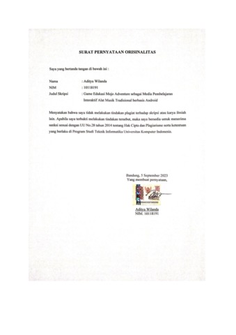 Wilanda, Aditya (2023) Game Edukasi “Mojo Adventure” Sebagai Media Pembelajaran Interaktif Alat Musik Tradisional Berbasis Android. Other thesis, Universitas Komputer Indonesia.