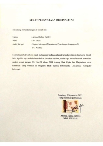 Fahlevi, Ahmad Fahmi (2023) Sistem Informasi Manajemen Penerimaan Karyawan Di PT Adetex. Other thesis, Universitas Komputer Indonesia.