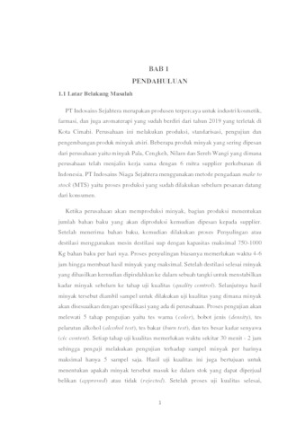 PT Indosains Niaga Sejahtera adalah perusahaan bergerak di bidang produksi, standardisasi, pengujian dan pengembangan produk minyak atsiri. Proses produksi yang terjadi di perusahaan antara lain penyulingan, uji kualitas, dan pengemasan. Hasil produksi minyak dibagi menjadi 2 kategori yaitu approved dan rejected yang berarti produk dapat diperjual belikan atau tidak. Saat ini masalah yang terjadi di PT Indosains Niaga Sejahtera adalah kurangnya solusi dari Kepala Produksi dalam memonitoring dan mengendalikan hasil produksi dengan kategori rejected setelah produk di Uji Kualitas sehingga produk tersebut tidak dapat diperjual belikan dan berdampak kepada kerugian materi serta kualitas produk tersebut. Maka dengan permasalahan tersebut dibutuhkan Sistem Informasi Manajemen Produksi di PT Indosains Niaga Sejahtera. Metode monitoring dan pengendalian produksi yang digunakan adalah metode Six Sigma dengan model DMAIC (Define, Measure, Analyze, Improve, Control). Sementara model analisis sistem informasi manajemen, peneliti menggunakan model PDCA yang berguna untuk membantu perusahaan dalam memonitoring produksi dengan baik. Berdasarkan hasil pengujian Blackbox dan penerimaan pengguna akhir, maka dapat diperoleh kesimpulan bahwa sistem yang dibangun dapat membantu kepala produksi dalam memonitoring dan mengendalikan hasil produksi dengan solusi yang dihadirkan.