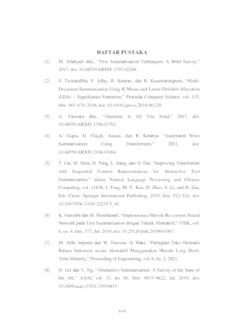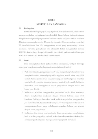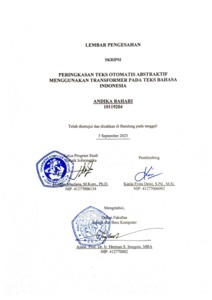 | Uncontrolled Keywords: | peringkasan teks abstraktif, Transformer, T5, Indonesia |