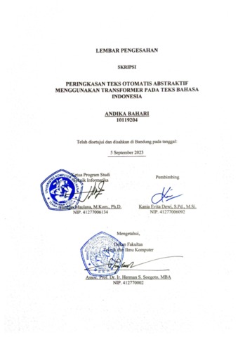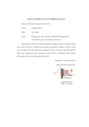 Bahari, Andika (2023) Peringkasan Teks Otomatis Abstraktif Menggunakan Transformer Pada Teks Bahasa Indonesia. Other thesis, Universitas Komputer Indonesia.
