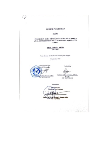 Akma, Arsy Opraza (2023) Penerapan Data Mining Untuk Prediksi Harga Jual Komoditas Di Dinas Pertanian Kabupaten Garut. Other thesis, Universitas Komputer Indonesia.