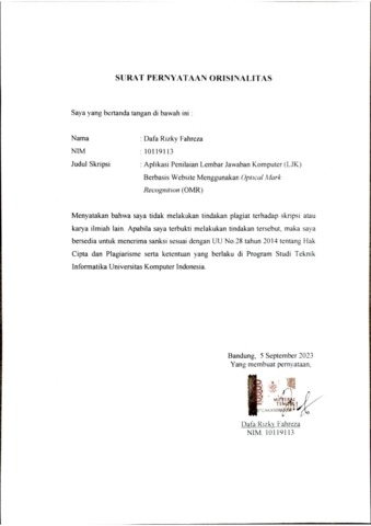 Fahreza, Dafa Rizky (2023) Aplikasi Penilaian Lembar Jawaban Komputer (Ljk) Berbasis Website Menggunakan Optical Mark Recognition (Omr). Other thesis, Universitas Komputer Indonesia.