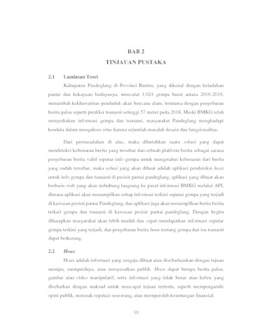 Kabupaten Pandeglang, terletak di Provinsi Banten, adalah daerah yang kaya akan kekayaan alam dan budaya dengan panorama pantai yang mempesona. Namun, daerah ini sering kali menghadapi gempa bumi, dengan catatan 1024 gempa yang terjadi antara tahun 2010-2018. Seringnya penyebaran berita palsu atau hoax tentang gempa dan potensi tsunami setelah kejadian gempa memperparah kekhawatiran warga setempat. Studi kuesioner menunjukkan sebanyak 56% dari 100 responden menyatakan adanya penyebaran 5-10 hoax setahun nya terkait gempa. Berita palsu tersebut, termasuk prediksi tsunami setinggi 57 meter, berpotensi menimbulkan kepanikan di kalangan masyarakat. Meski BMKG menyediakan informasi resmi mengenai gempa dan tsunami, berbagai masalah pada situs mereka membuat akses informasi menjadi sulit bagi masyarakat. Sebagai solusi, penelitian ini mengusulkan pembuatan aplikasi berbasis web yang terintegrasi dengan BMKG untuk mendeteksi dan menyebarkan informasi valid seputar gempa dan tsunami di Pandeglang, dengan tujuan mengurangi penyebaran berita hoax dan meningkatkan kesadaran masyarakat.