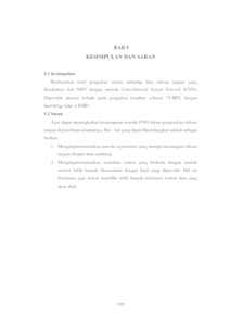 Convolutional Neural Network (CNN) merupakan metode yang memanfaatkan fitur konvolusi dalam mengekstraksi ciri pada citra. Pada penelitian sebelumnya telah dilakukan Intelligence Character Recognition (ICR) menggunakan CNN dengan tingkat akurasi mencapai 97,6% pada Arabic Handwritten Character Dataset. Pada penelitian lainnya CNN dikatakan unggul dalam kasus pengenalan menggunakan data citra. Dari jejak penelitian tersebut, fokus utama dari penelitian ini adalah mengukur kemampuan CNN pada kasus ICR alfabet Inggris dengan data berasal dari National Institute of Standards and Technology (NIST) sebanyak 15,872 data latih dan 3,100 data uji dengan kelas karakter meliputi A-Z, a-z, dan 0-9. Sebelum tahap pelatihan dan pengujian CNN, dilakukan preprocessing yang terdiri dari grayscaling, smoothing, thresholding, segmentasi, dan scaling. Tahap feedforward CNN terdiri dari layer ekstraksi dan layer klasifikasi. Setelah feedforward, dilakukan perbaikan bobot dan bias ketika pelatihan menggunakan backpropagation sehingga dapat digunakan untuk pengujian. Adapun parameter uji yang digunakan dalam penelitian ini adalah nilai learning rate yang berbeda – beda untuk mengetahui akurasi dari setiap kondisi. Pada tahap pengujian diperoleh akurasi tertinggi mencapai 72.48%.