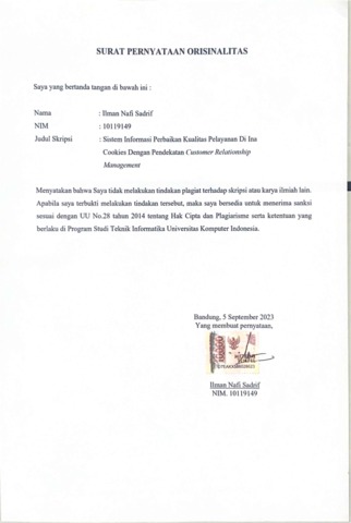 Sadrif, Ilman Nafi (2023) Sistem Informasi Perbaikan Kualitas Pelayanan Di Ina Cookies Dengan Pendekatan Customer Relationship Management. Other thesis, Universitas Komputer Indonesia.
