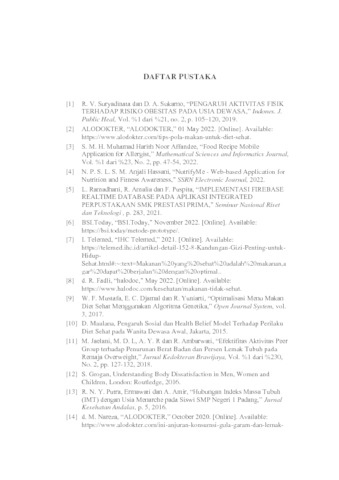 Memiliki tubuh ideal tentu menjadi dambaan sebagian besar orang. Ada banyak cara untuk mendapatkannya, salah satu caranya adalah diet. Diet di zaman sekarang ini sudah menjadi gaya hidup masyarakat di kota. Banyak faktor yang mempengaruhi peningkatan kelebihan berat badan dan obesitas seperti faktor sosial ekonomi, demografis, geografis, gaya hidup dan nutrisi. Masalah yang dihadapi wanita saat ingin mengikuti program diet yaitu kurang mengetahui kandungan makananan yang dimakan, kurang dapat memonitoring makanan apa yang sudah dimakan, selain itu juga kurang mengetahui rekomendasi makanan selanjutnya dalam program diet sehat. Tujuan peneliti dalam mengambil topik ini yaitu memberikan sebuah solusi berupa informasi kandungan makanan seperti kandungan lemak dan kalori, memberikan informasi kepada wanita jika sudah melewati batas kandungan makanan dalam seharinya, serta memberikan rekomendasi makanan. Metode yang digunakan dalam pembuatan aplikasi ini yaitu metode pengumpulan data (studi literatur, kuisioner, dan wawancara), selain itu juga metode pembangunan perangkat lunak waterfall (Requirements Analysis, System and Software Design, Implementation and Unit Testing, Integration and System Testing, Operation and Maintenance). Pembangunan aplikasi yang dibuat memanfaatkan teknologi kamera, API Spoonacular, API Clarifai, dan Realtime Database dari Firebase sebagai penyimpanan data secara online. Hasil yang diharapkan dalam pembuatan aplikasi ini adalah sistem yang dibangun dapat memberikan solusi kepada pengguna berupa informasi kandungan makanan seperti kandungan kalori, lemak, dan karbohidrat, sehingga membantu wanita dalam perencanaan diet nya. Sistem dapat memberikan sebuah pesan dialog sebagai batasan kepada pengguna dalam mengonsumsi makanan agar tidak melebihi kandungan dalam per harinya, dan sistem yang dibangun dapat memberikan sebuah rekomendasi makanan agar dapat membantu pengguna dalam memilih makanannya.