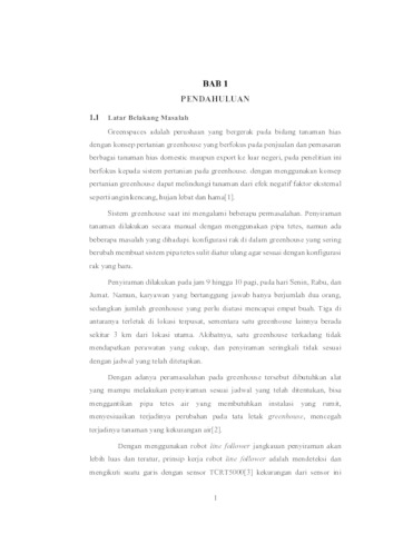 dengan sensor ROKO sn04-n. Hasil pengujian menunjukkan bahwa robot ini mampu melakukan penyiraman sesuai jadwal, mengoptimalkan penggunaan air, dan beradaptasi dengan perubahan konfigurasi greenhouse. Penelitian ini diharapkan dapat meningkatkan produktivitas dan efisiensi pertanian dalam greenhouse, membantu Greenspaces memenuhi permintaan pasar yang terus berkembang untuk tanaman hias berkualitas.