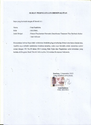 Faathirza, Ivan (2023) Sistem Penyiraman Otomatis Greenhouse Tanaman Hias Berbasis Robot Line Follower. Other thesis, Universitas Komputer Indonesia.