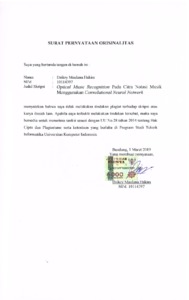 | Uncontrolled Keywords: | Optical Music Recognition, Machine Learning, Convolutional Neural Network, Arsitektur Convolutional Neural Network, Pengenalan Notasi Musik |